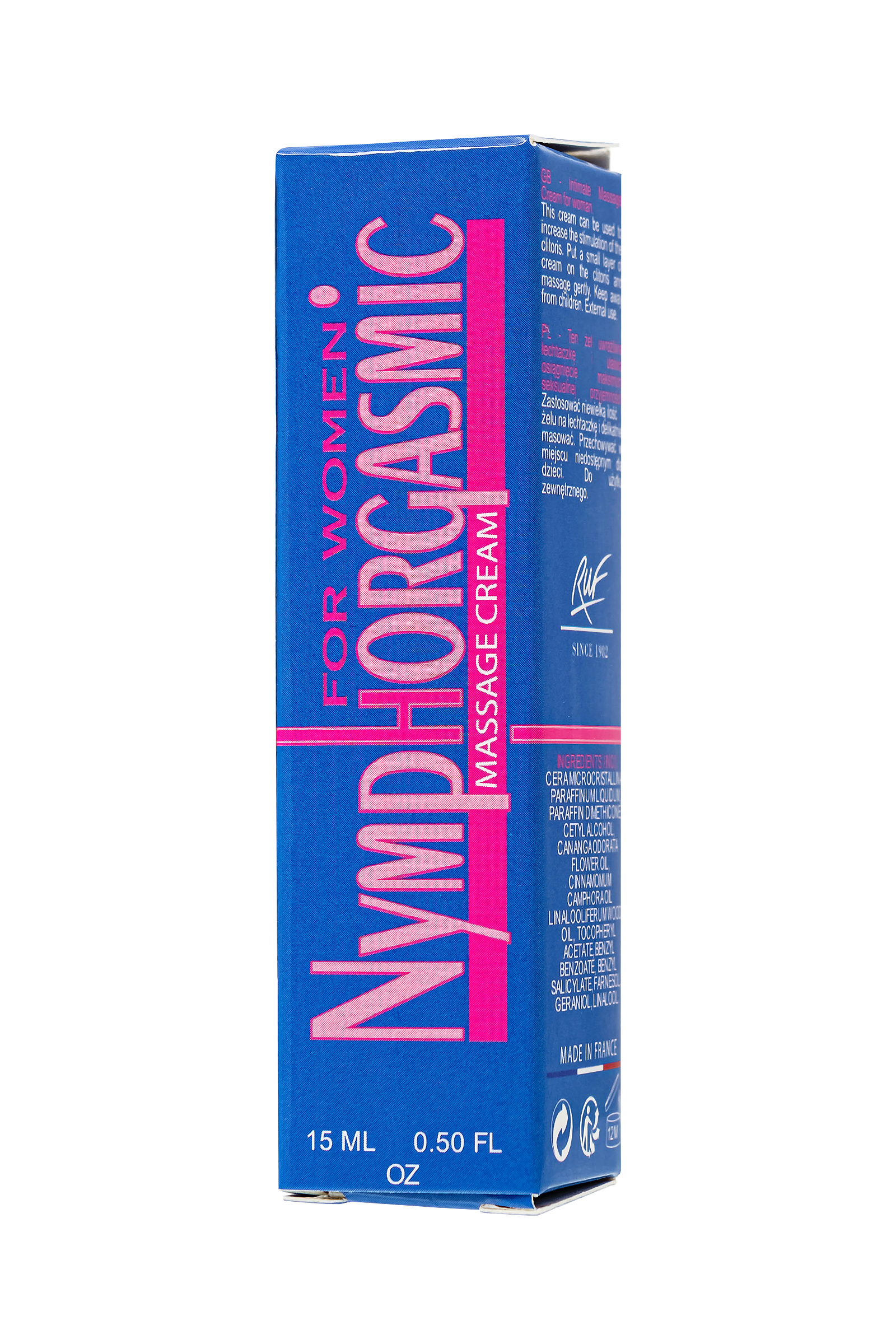 Nymphorgasmic — это крем, созданный специально для женщин, чтобы усилить чувствительность и облегчить достижение оргазма. Сочетание мощных натуральных ингредиентов, таких как иланг-иланг, камфора и витамин Е, делает этот крем незаменимым для тех, кто хочет улучшить свою интимную жизнь и усилить ощущения во время полового акта. Иланг-иланг известен как сексуальный стимулятор, который усиливает возбуждение и улучшает чувствительность, а камфора — это афродизиак, который стимулирует приток крови к интимным зонам, усиливая сексуальное удовольствие. Витамин Е заботится о коже, делая ее мягкой и увлажненной, что создает дополнительный комфорт. Nymphorgasmic идеально подходит для женщин, испытывающих сложности с достижением оргазма, либо желающих усилить интимные ощущения. Этот крем станет вашим верным помощником в обретении новых уровней наслаждения и интимной близости. Рекомендации по применению: нанесите небольшое количество крема на интимную зону перед началом полового акта и мягко втирайте до полного впитывания. Форма выпуска: Туба 15 мл Производство: Франция