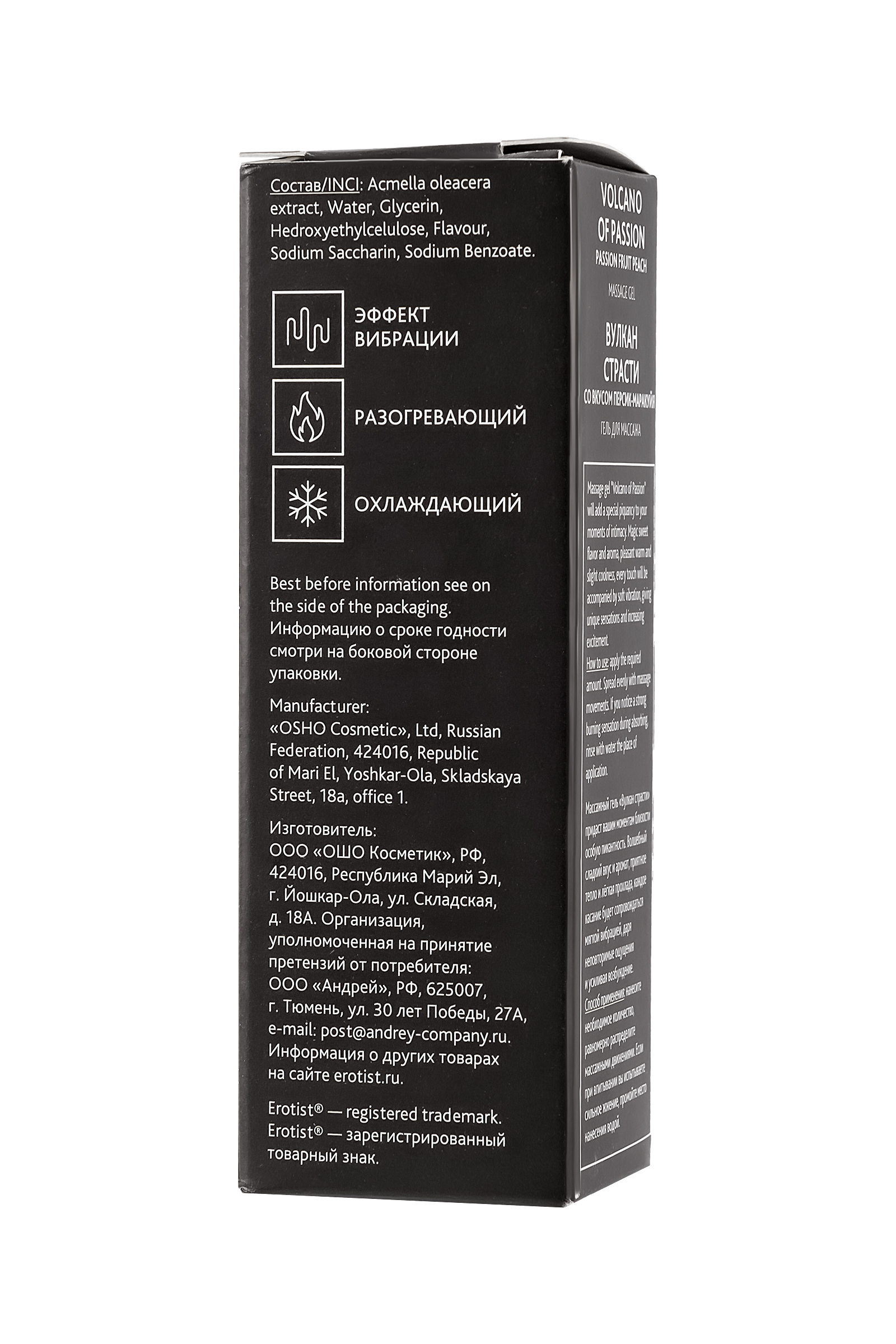 Массажный гель Эротист «Вулкан страсти» придаст вашим моментам близости особую пикантность. Волшебный сладкий вкус и аромат, приятное тепло и лёгкая прохлада, каждое касание будет сопровождаться мягкой вибрацией, даря неповторимые ощущения и усиливая возбуждение. Нанесите немного жидкого геля на интимные зоны, и через несколько секунд вы почувствуете тепло, затем в течение 2-3 минут легкую вибрацию и легкий холодок. Длительность эффекта зависит от особенностей вашего организма. Гель с вибрирующим эффектом для интимных зон На основе натуральных ингредиентов, без парабенов Вкус и аромат персик-маракуйя Подходит для поцелуев и орального секса Способ применения: нанесите небольшое количество геля на кончики пальцев и коснитесь клитора и вагинальных губ, массируя. Для наружного применения.