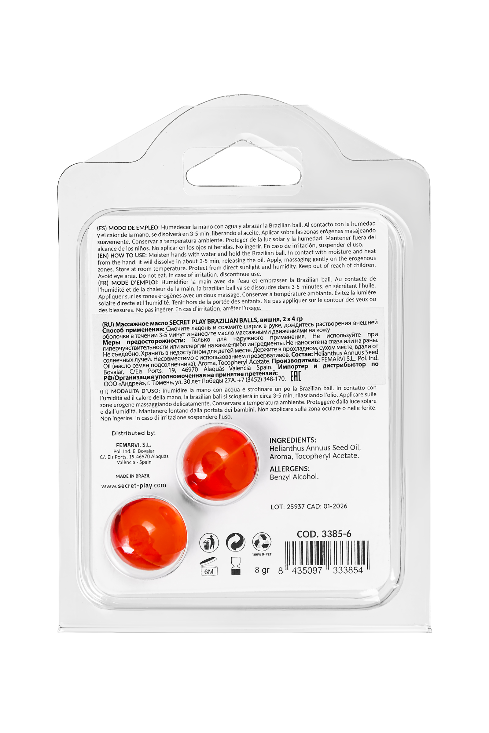 Brazilian Balls Cherry — это чувственное массажное масло в оригинальном формате от Secret Play, которое добавит страсти и игривости в ваши интимные моменты. Эти бразильские шарики созданы для тех, кто хочет внести нотку романтики и интриги в свои эротические игры. Каждый шарик наполнен ароматным массажным маслом с насыщенным ароматом спелой вишни, которое пробуждает чувства и создает атмосферу сладостного наслаждения. Бразильские шарики плавятся в ваших руках под воздействием тепла и влажности, превращаясь в нежное масло, идеально подходящее для мягких прикосновений и чувственного массажа. Этот продукт создает атмосферу близости и возбуждения, сочетая волнующий аромат вишни с шелковистым скольжением масла. Откройте для себя новые грани наслаждения, подарив вашим моментам романтику и страсть. Как это работает? Просто смочите руку водой, обнимите шарик ладонью, и он начнет таять. Через 3–5 минут шарик полностью растворится, превращаясь в масло, которое вы сможете нежно нанести на эрогенные зоны, усиливая прелюдию и создавая волнующую атмосферу близости. С Brazilian Balls Cherry от Secret Play ваши интимные моменты станут еще более страстными, чувственными и запоминающимися. Насладитесь сладким ароматом и нежными прикосновениями в каждой капле масла! Оригинальный формат добавляет интригу и игривость в интимные моменты Насыщенный аромат спелой вишни пробуждает чувства и создает романтическое настроение Легко превращается в нежное масло для чувственного массажа, даря мягкость и гладкость прикосновениям Простота использования: достаточно тепла и влажности рук, чтобы шарик растаял Идеально подходит для прелюдии, эротического массажа и нежных ласк В комплекте: 2 бразильских шарика по 4 грамма каждый Внешний слой — вода, внутренняя жидкость — масло Несовместимо с использованием презервативов Состав: Масло семян подсолнечника однолетнего, ароматизатор, токоферола ацетат. Способ применения: Смочите руку водой и обнимите ладонью шарик, чтобы он начал таять. Подержите шарик в ладони, пока он полностью не растворится (3–5 минут). Нанесите полученное масло легкими массирующими движениями на эрогенные зоны и наслаждайтесь нежными прикосновениями и волнующим ароматом. Меры предосторожности: Храните при комнатной температуре, избегая прямых солнечных лучей и высокой влажности. Не наносите на область глаз или поврежденную кожу. Не глотайте и храните в недоступном для детей месте. Прекратите использование при возникновении раздражения. Не совместимо с использованием презервативов.