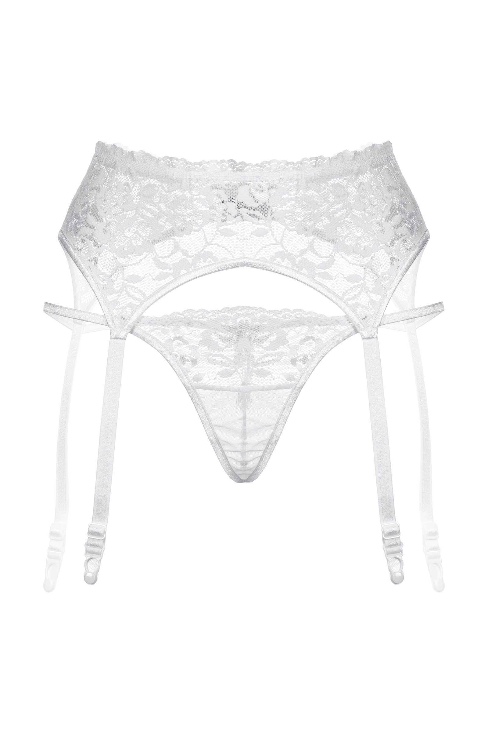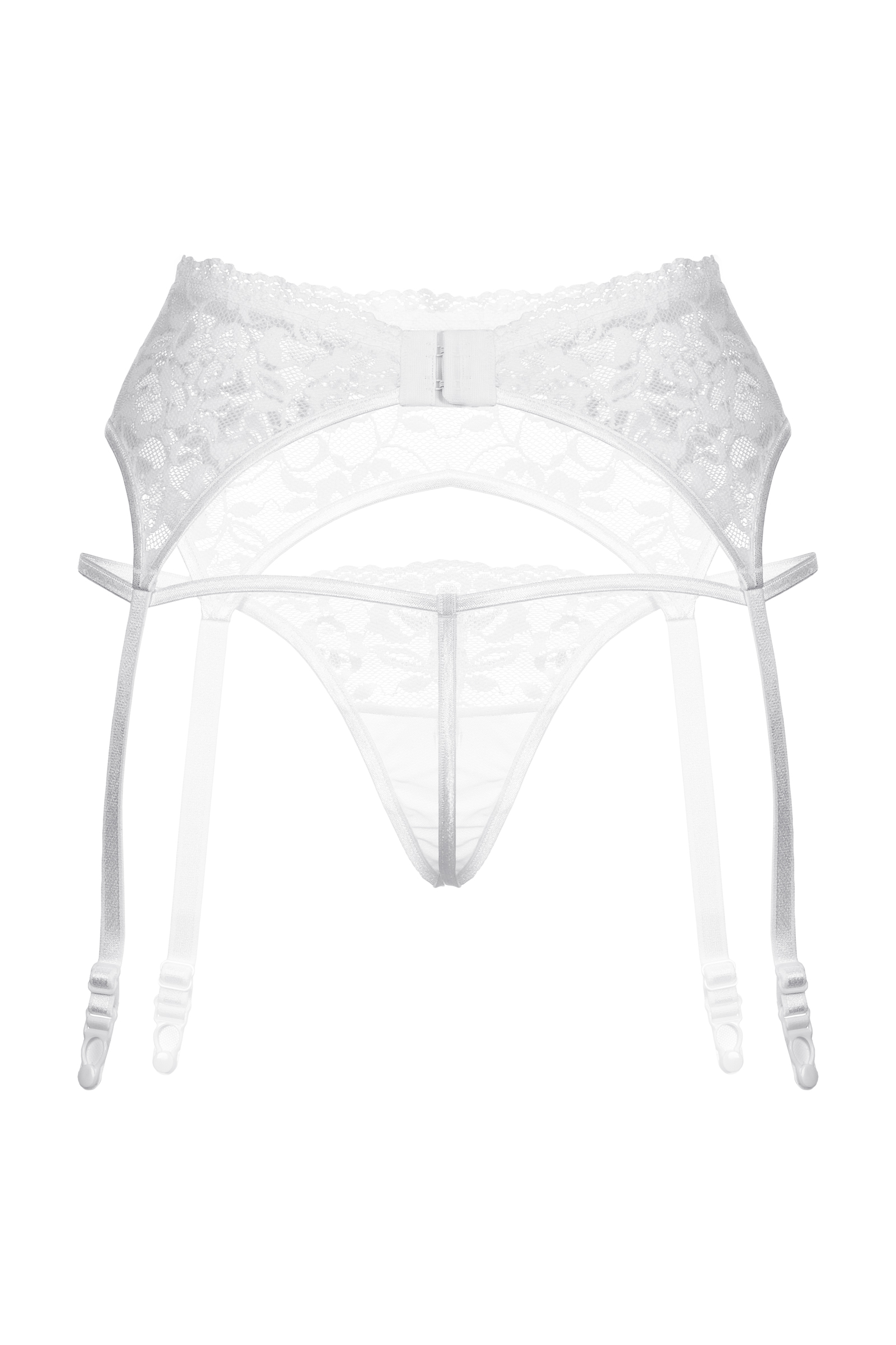 Комплект: пояс для чулок и стринги закрытые. Пояс выполнен из кружевного материала с цветочным арнаментом. Стринги из комбинированного материала: кружево (верхняя часть) и более плотная не прозрачная ткань (нижняя часть стрингов).