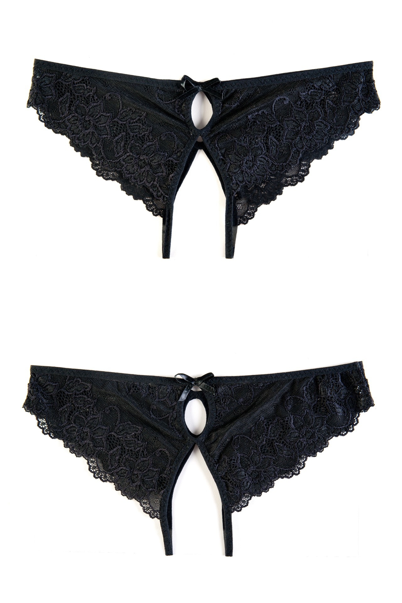 Эротические трусики кружевные, эластичные, с фигурными вырезами, с атласными бантиками, свободный кружевной край.