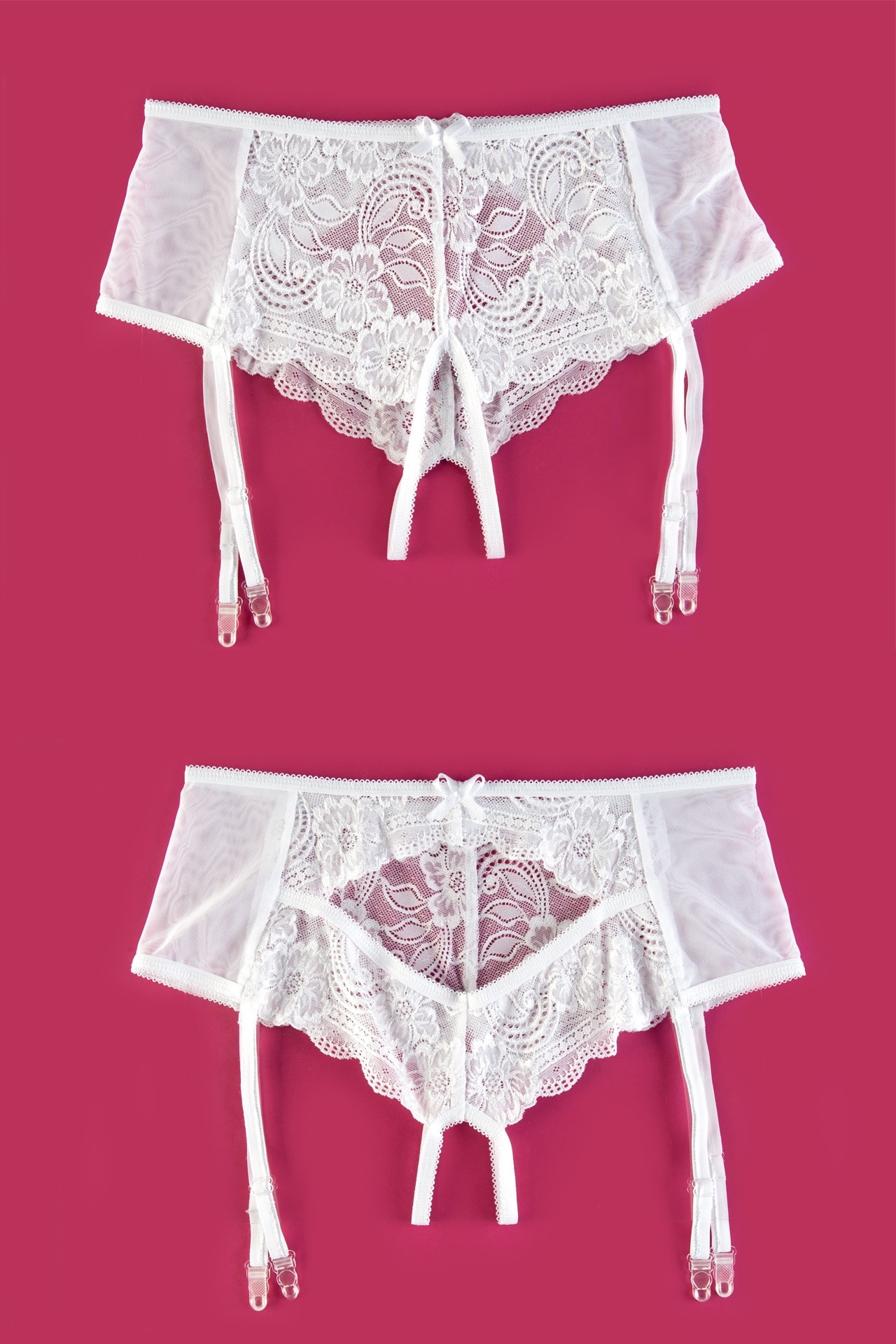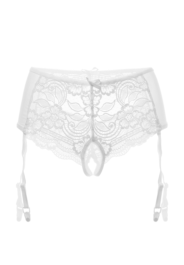 Эротические трусики-пояс из стрейч-сетки, эластичные, со сложными кружевными вставками, с вырезом сзади, без боковых швов, с атласными бантиками. Пажи съемные.