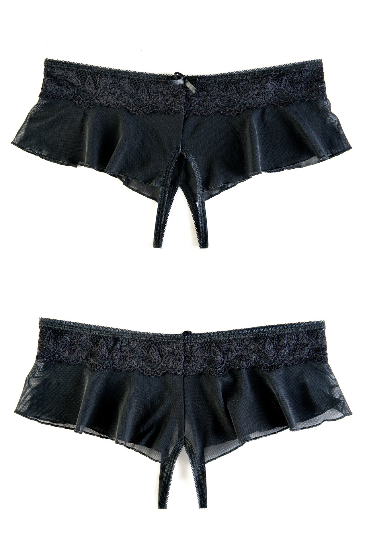 Эротические трусики-юбочка из стрейч-сетки, с кружевной кокеткой, с атласным бантиком спереди.